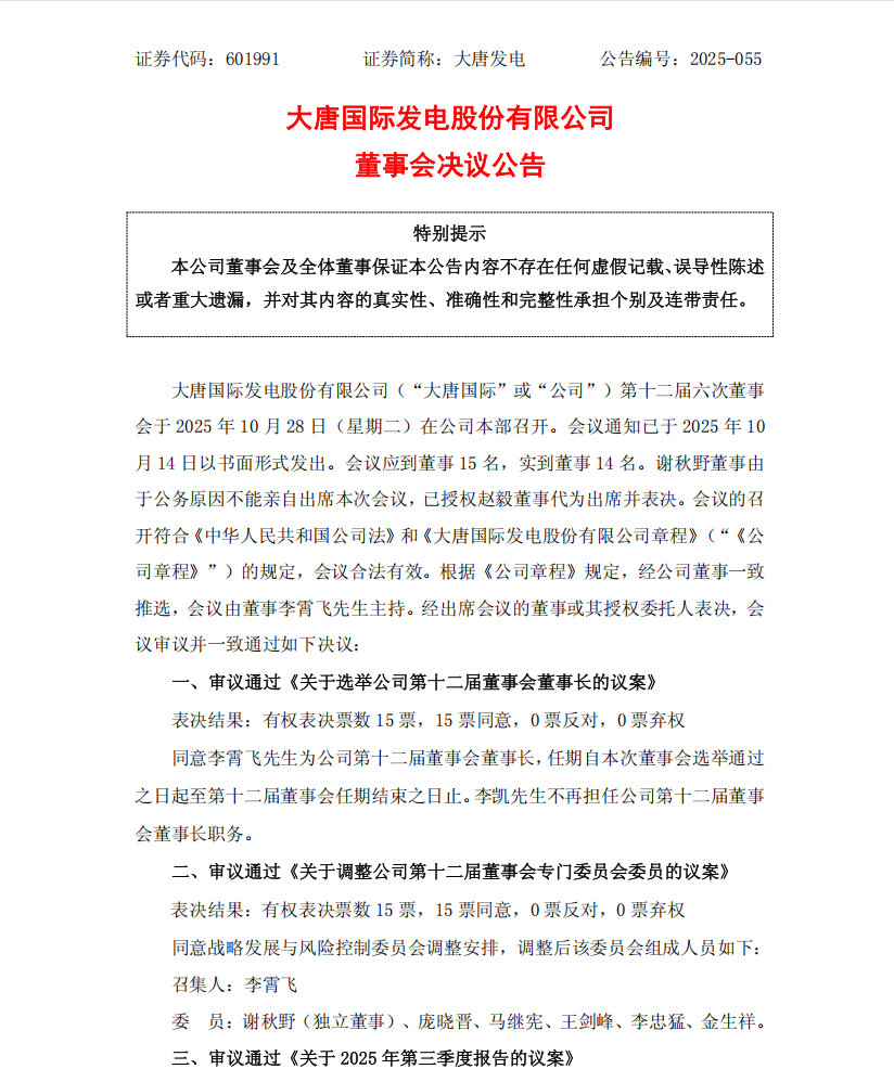 10月28日,大唐發電召開董事會,審議通過《關于選舉公司第十二屆董事會董事長的議案》,同意李霄飛先生為公司第十二屆董事會董事長,任期自本次董事會選舉通過之日起至第十二屆董事會任期結束之日止。李凱先生不再擔任公司第十二屆董事會董事長職務。