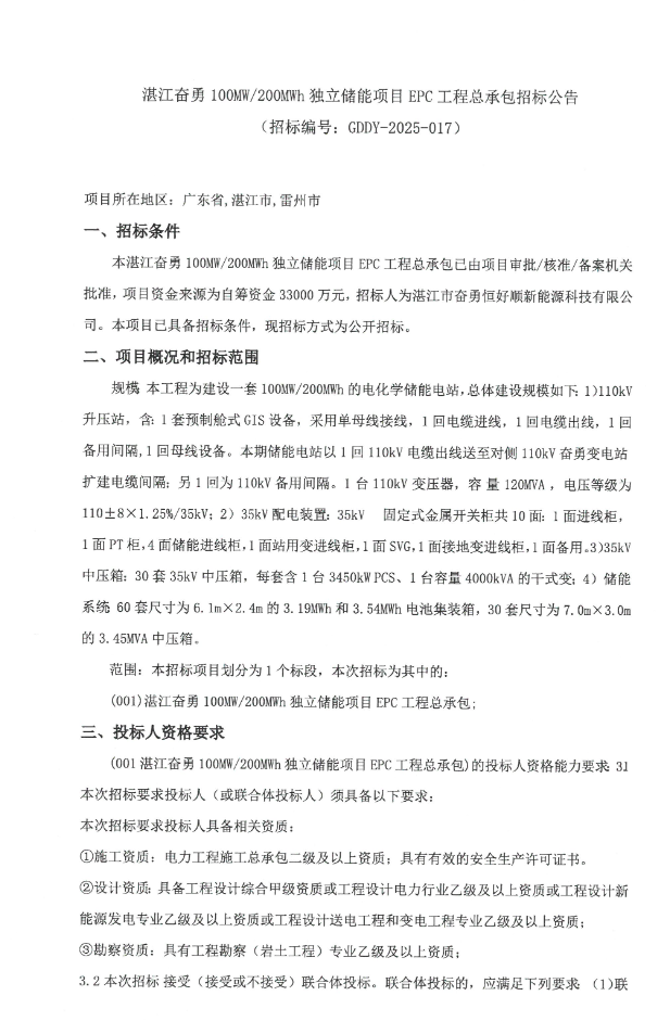 11月14日,湛江市奮勇恒好順新能源科技有限公司發布湛江奮勇100MW/200MWh獨立儲能項目EPC工程總承包招標公告。項目位于廣東省湛江市雷州市,建設一套100MW/200MWh的電化學儲能電站。