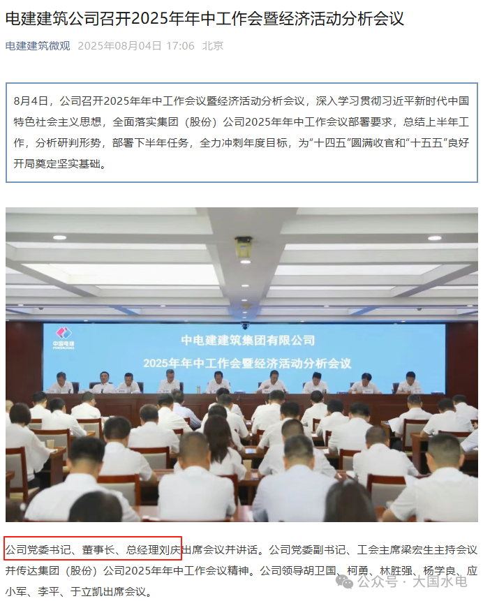 2025年7月14日,中國電建召開電建建筑公司干部大會,宣布電建建筑公司主要負(fù)責(zé)人任職決定: