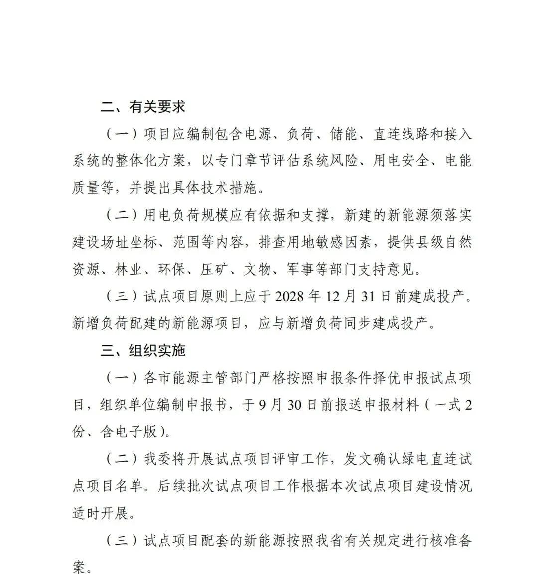 試點項目原則上應于2028年12月31日前建成投產。新增負荷配建的新能源項目,應與新增負荷同步建成投產。