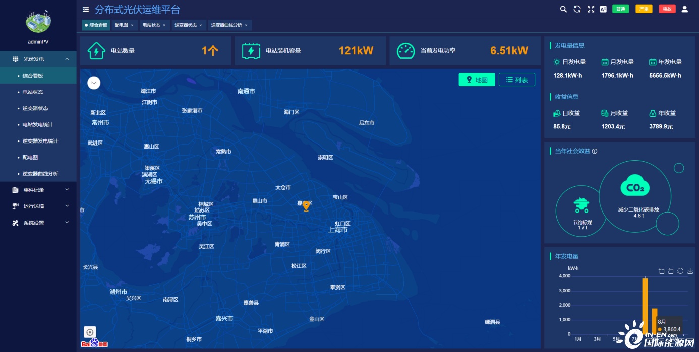 ●顯示所有光伏電站的數量,裝機容量,實時發電功率。