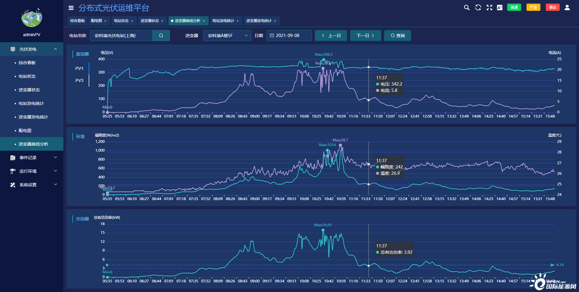 ●展示交、直流側電壓、功率、輻照度、溫度曲線。