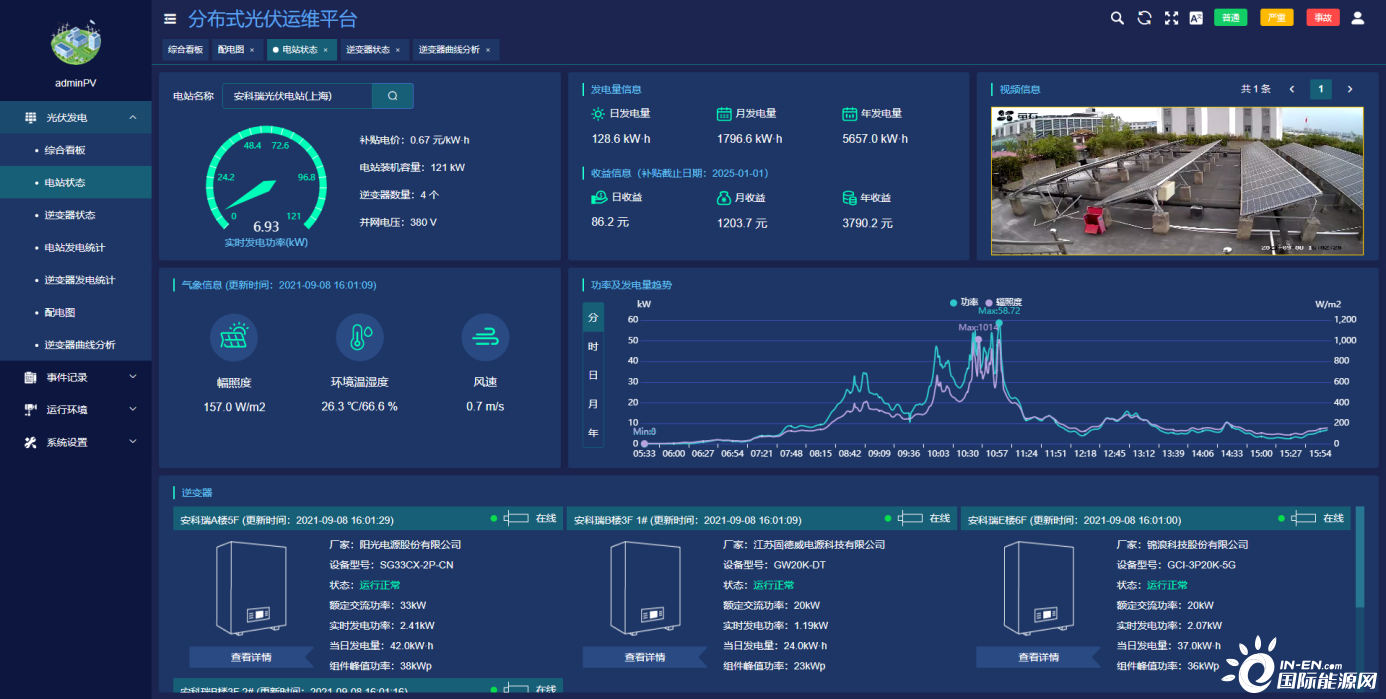 ●電站狀態展示當前光伏電站發電功率,補貼電價,峰值功率等基本參數。